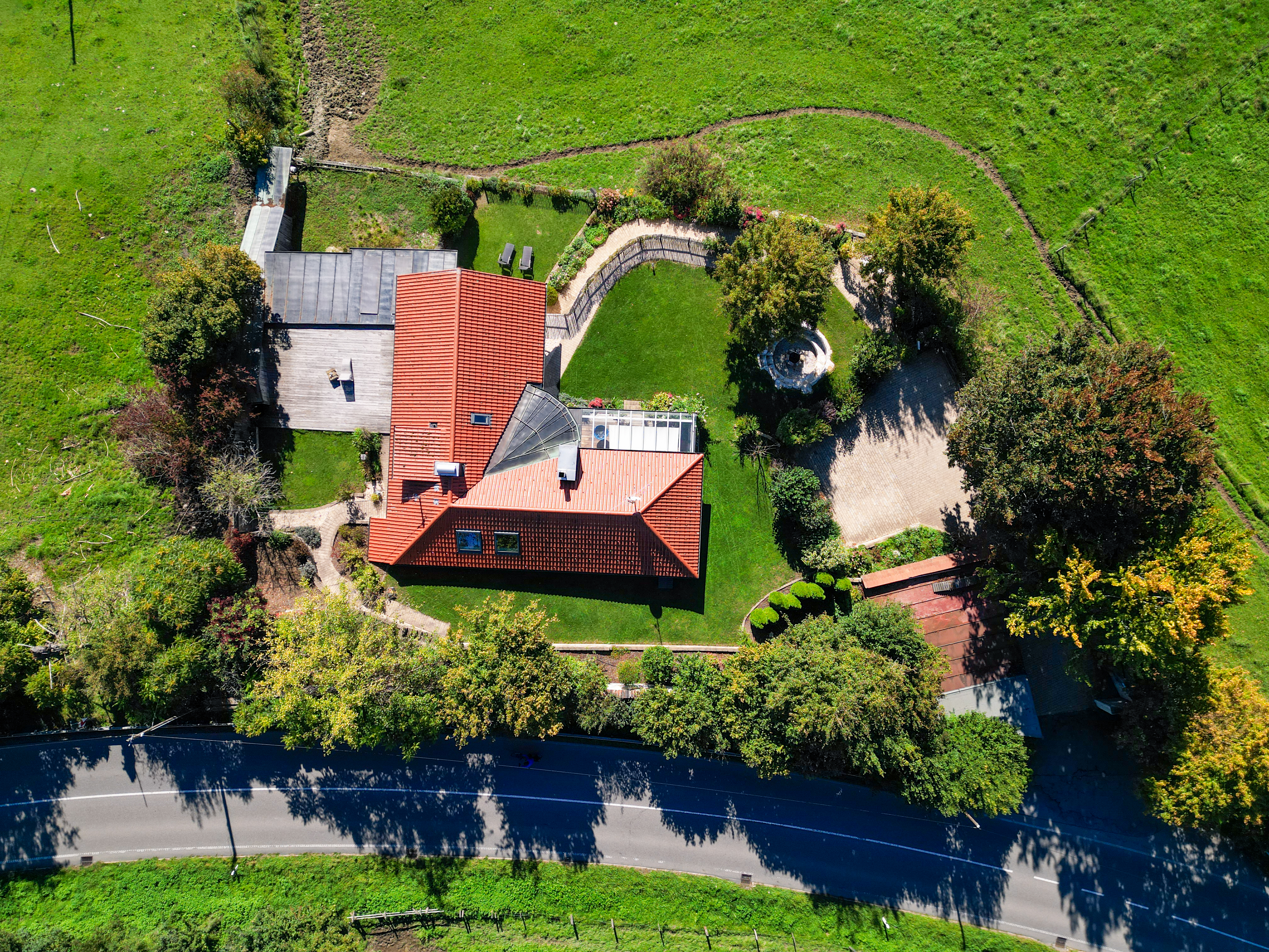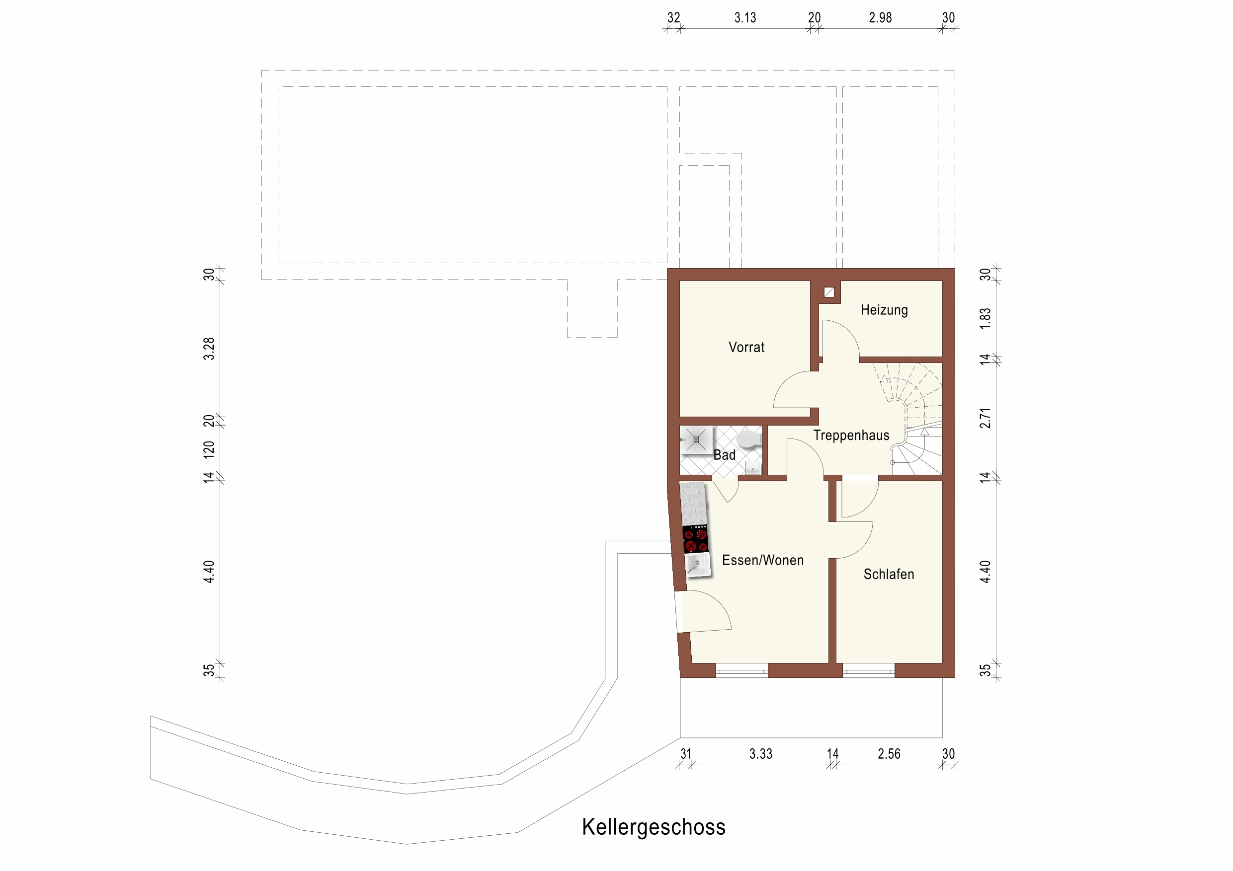 Im Untergeschoss des Hauses ist der Heizraum, ein Vorratsraum sowie eine kürzlich fertiggestellte Einliegerwohnung mit Schlafzimmer und Badezimmer mit Dusche und WC. Von dem Wohnzimmer mit Wohnküche gelangt man auf die großzügige Terrasse. Die Einliegerwohnung ist über einen Weg entlang des Gartens erreichbar und hat einen eigenen Zugang.