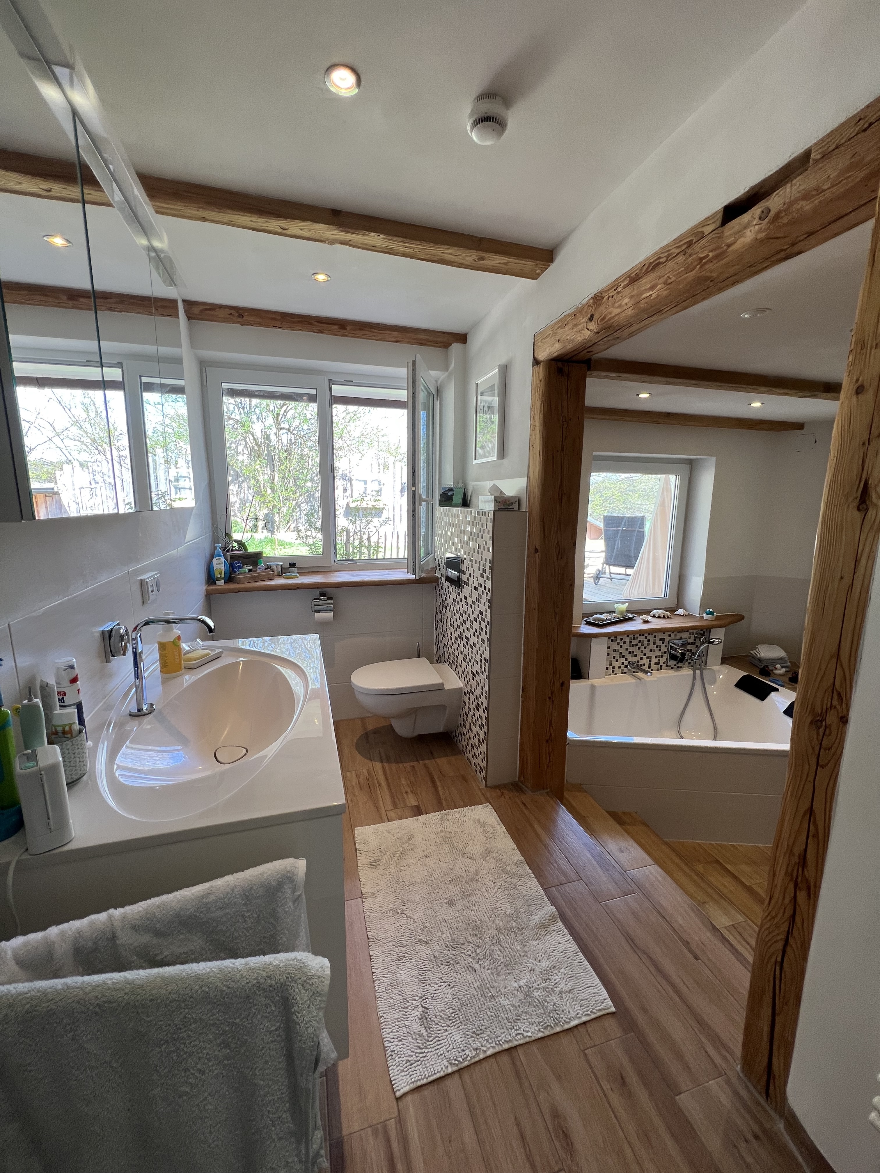 - Ausstattung des Bades Badewanne, Dusche, Fenster
