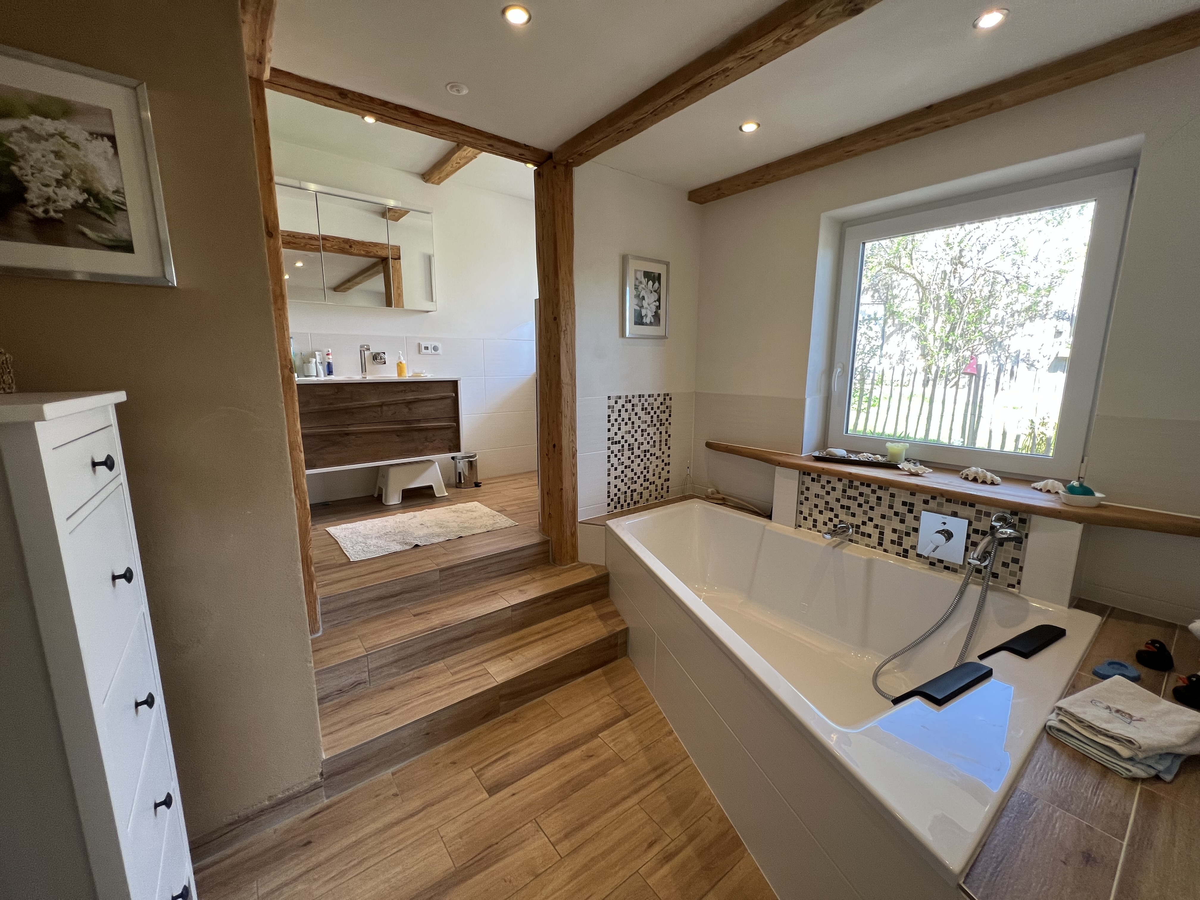 Zudem befindet sich im EG noch ein Badezimmer mit Dusche, Badewanne und WC, sowie ein großes Schlafzimmer.
