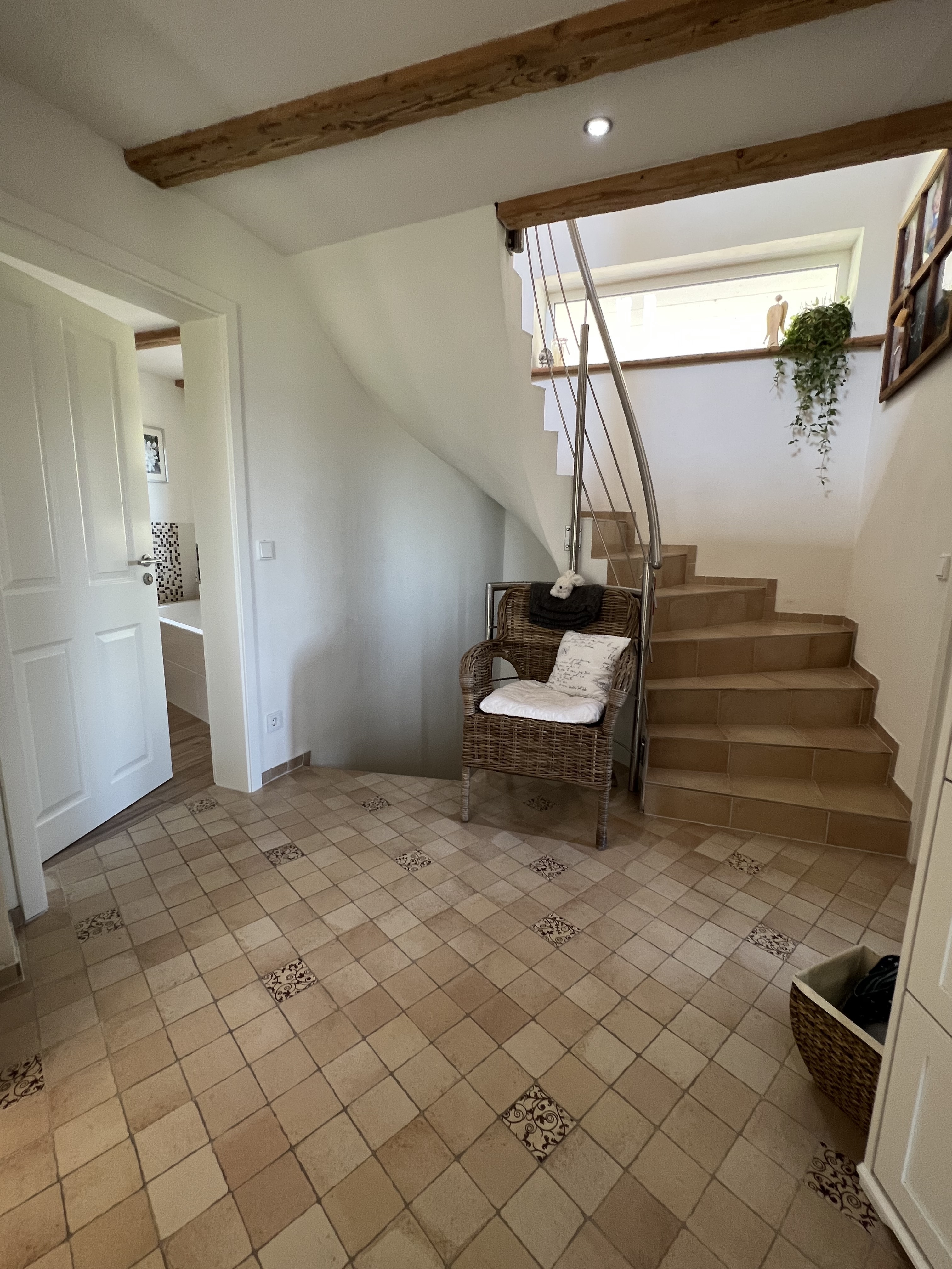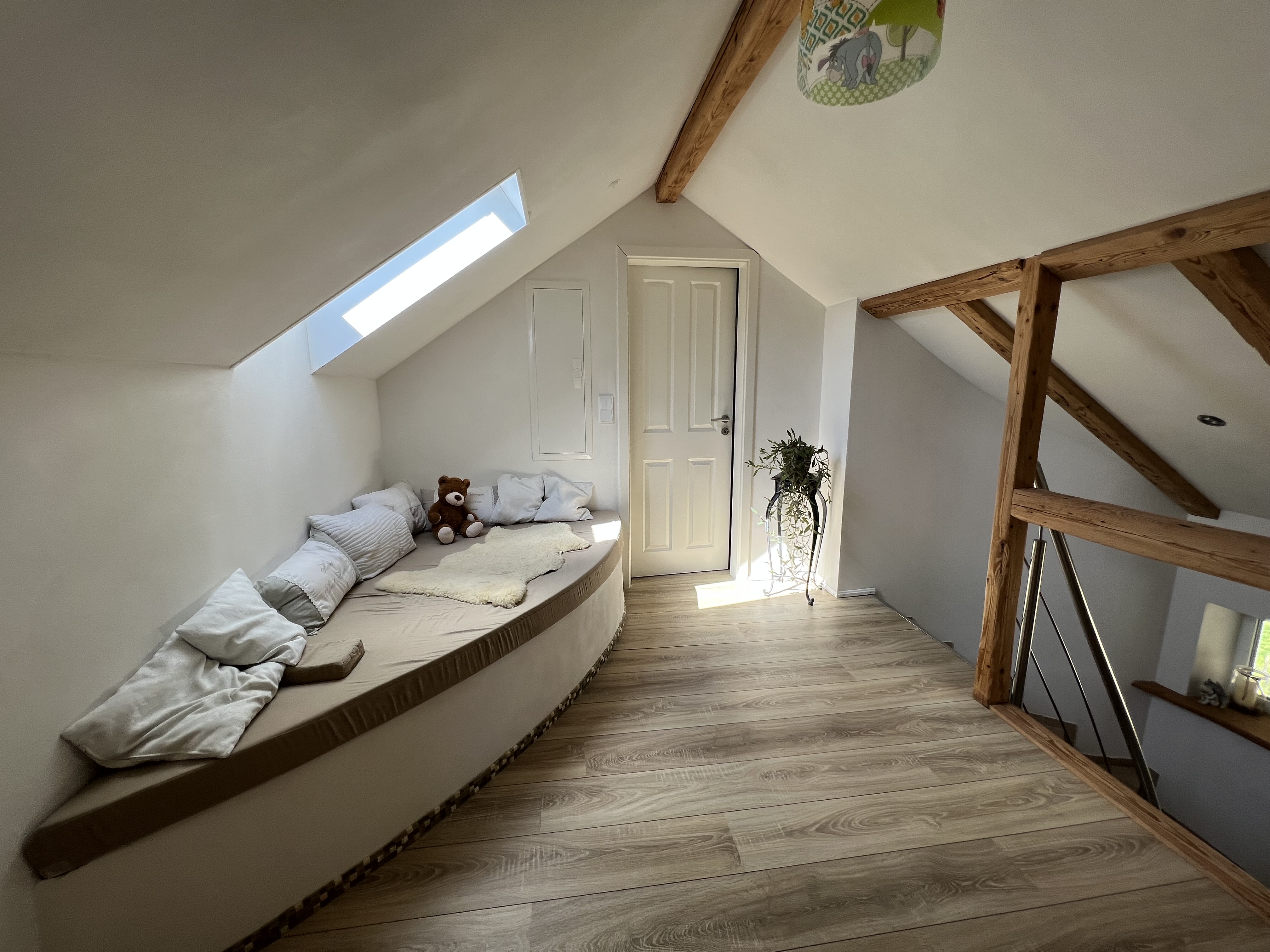 Über eine Treppe gelangt man in das Dachgeschoss.