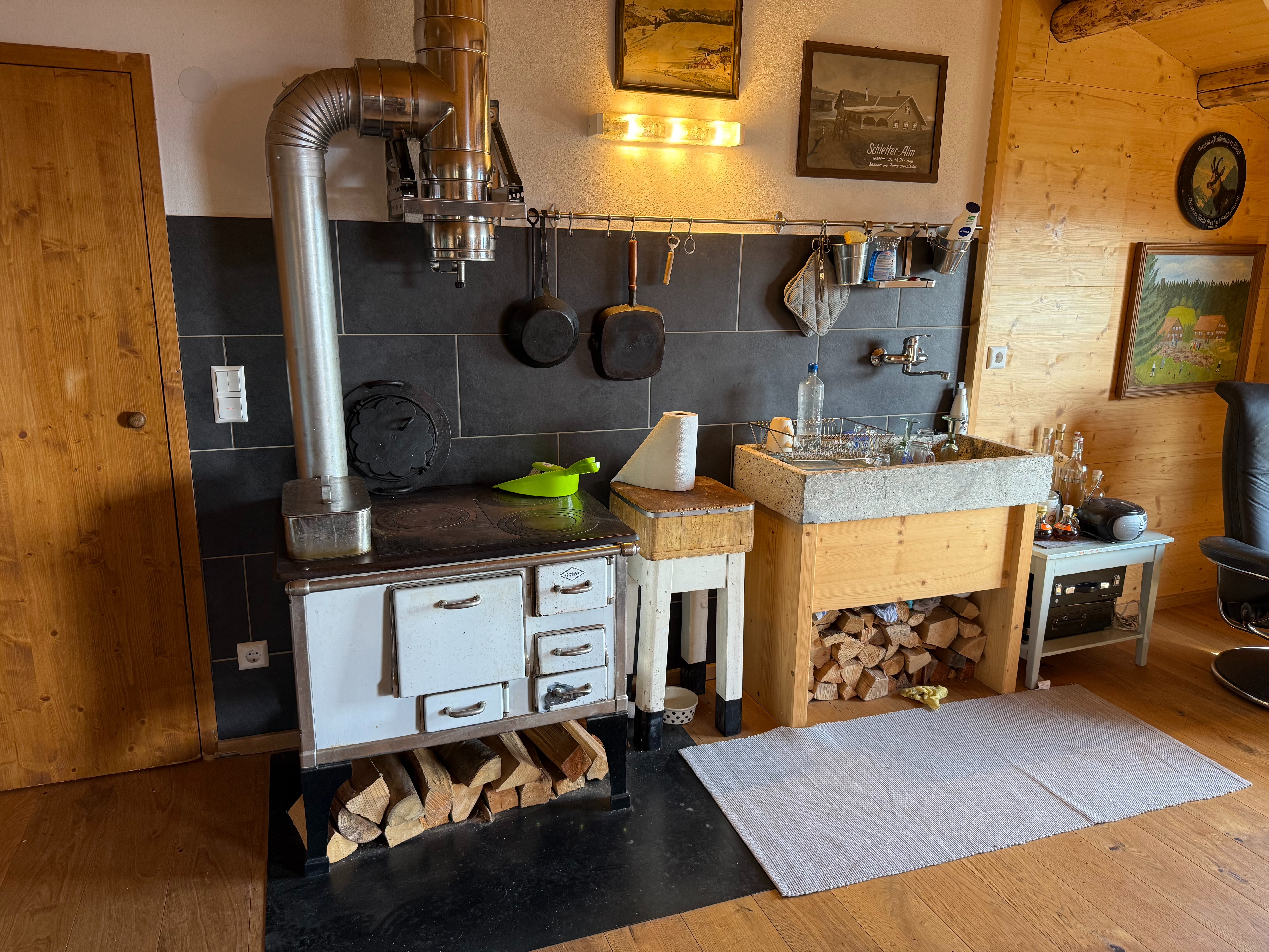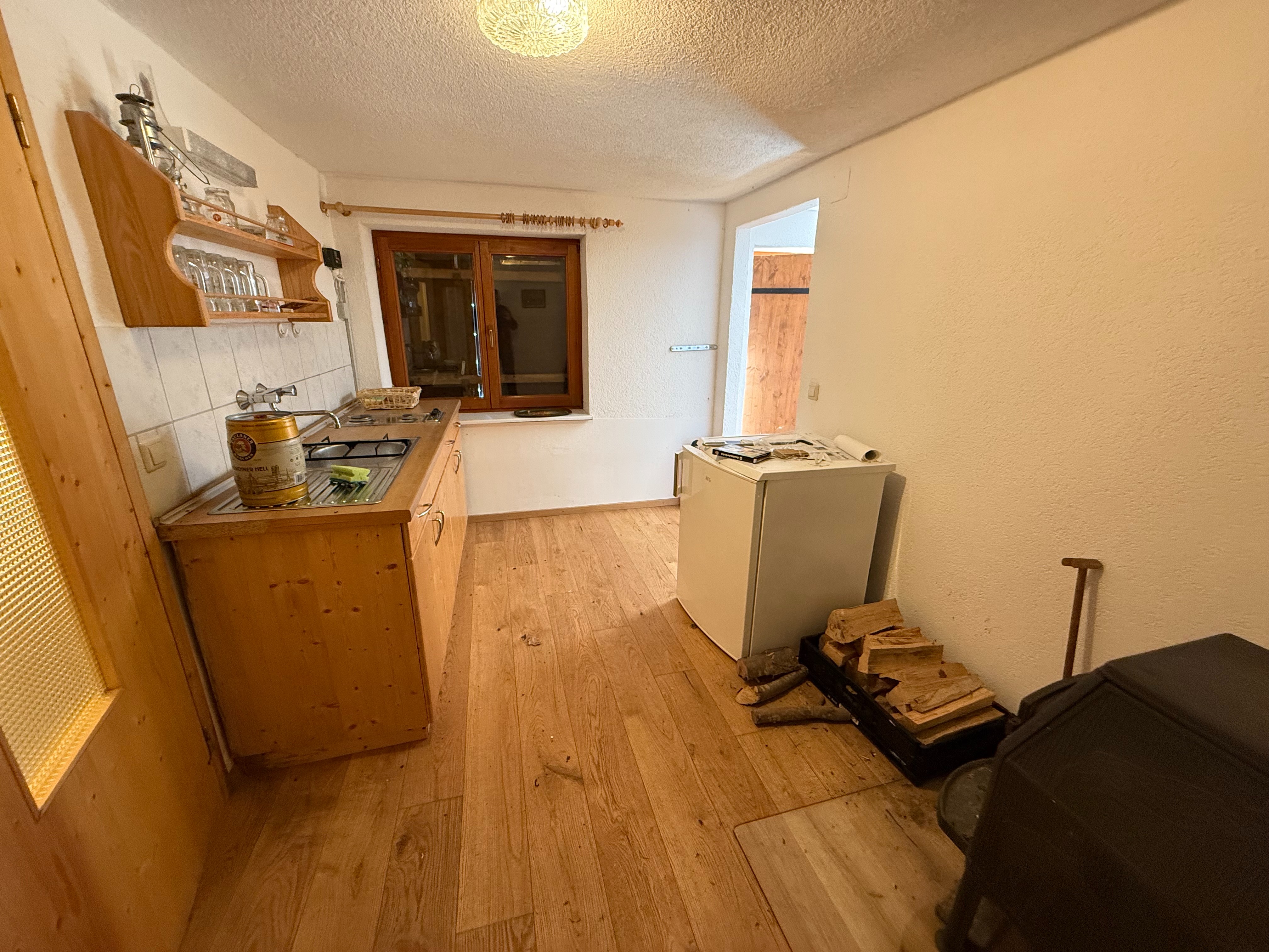 Gartengeschoß: Küche mit Kaminofen, Dusche/WC, Wohnstube oder Schlafzimmer, Terrasse
