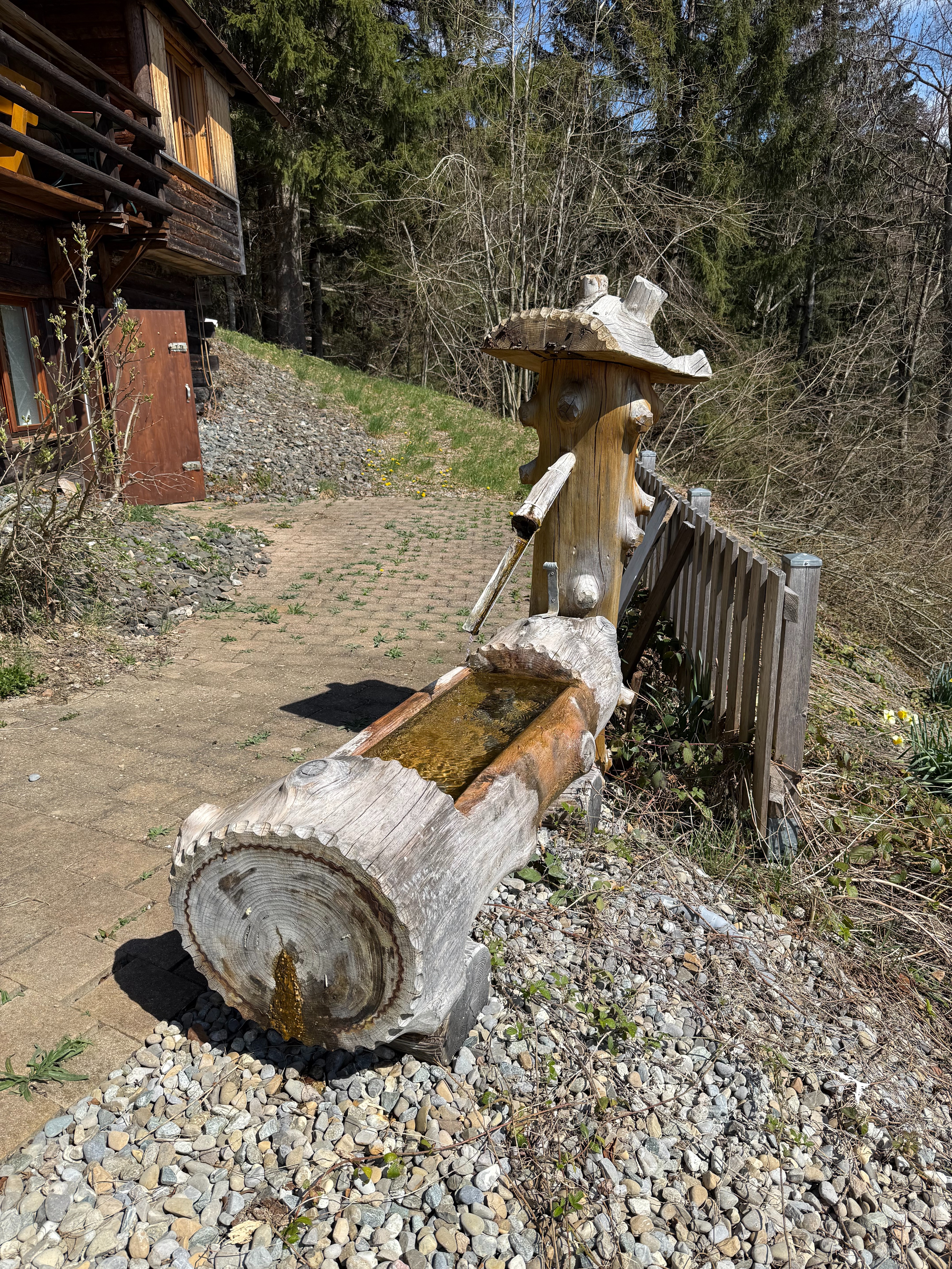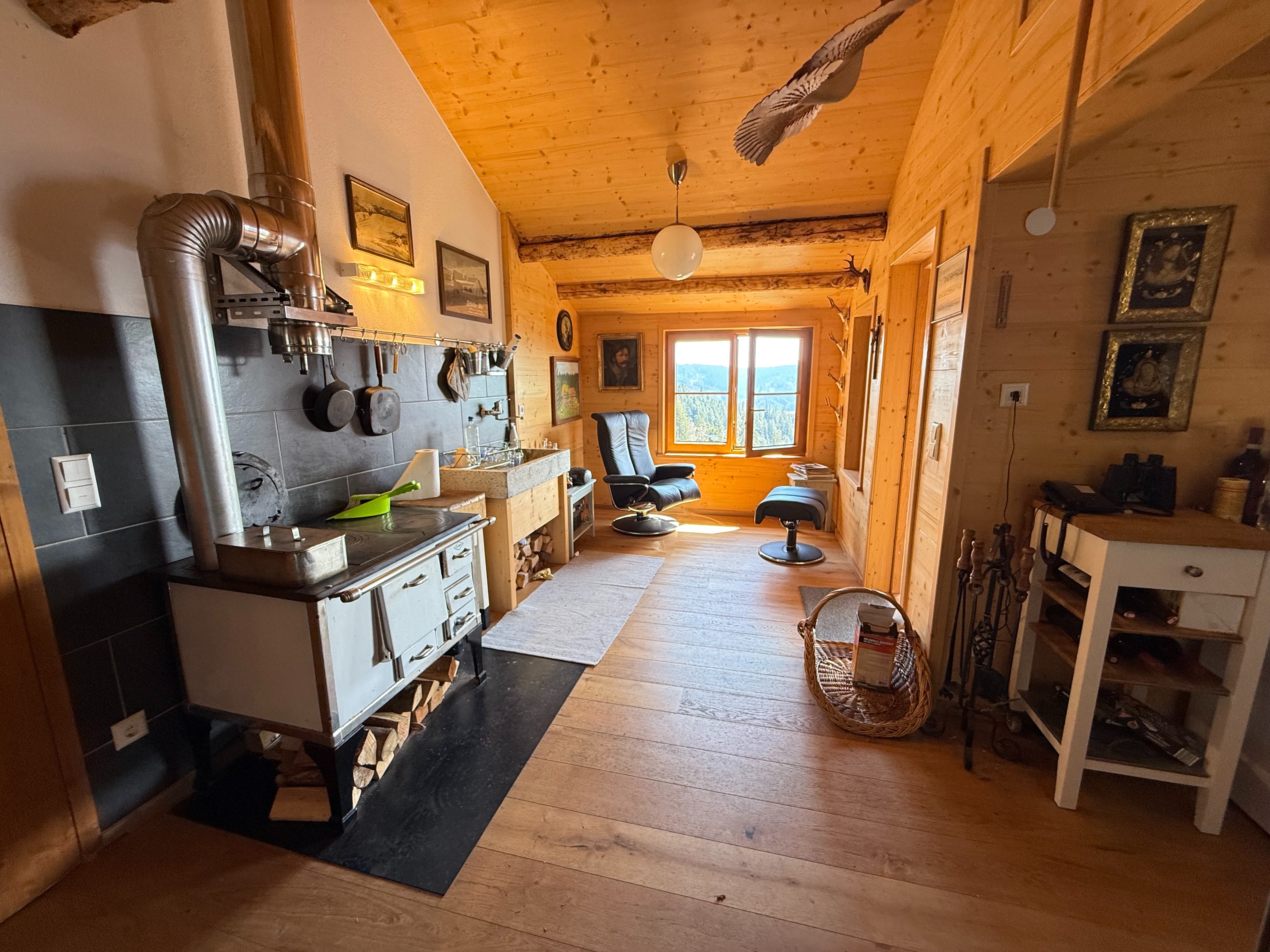Die Berghütte ist so gut eingewachsen, dass sie von außen nicht einsehbar ist. Die freie Lage bietet Ihnen den ganzen Tag Sonne und die Aussicht auf die Alpen, Berge, Wälder und Wiesen. Gemütlich und heimelig ist der Wohnbereich und romantisch das Äußere der Berghütte.