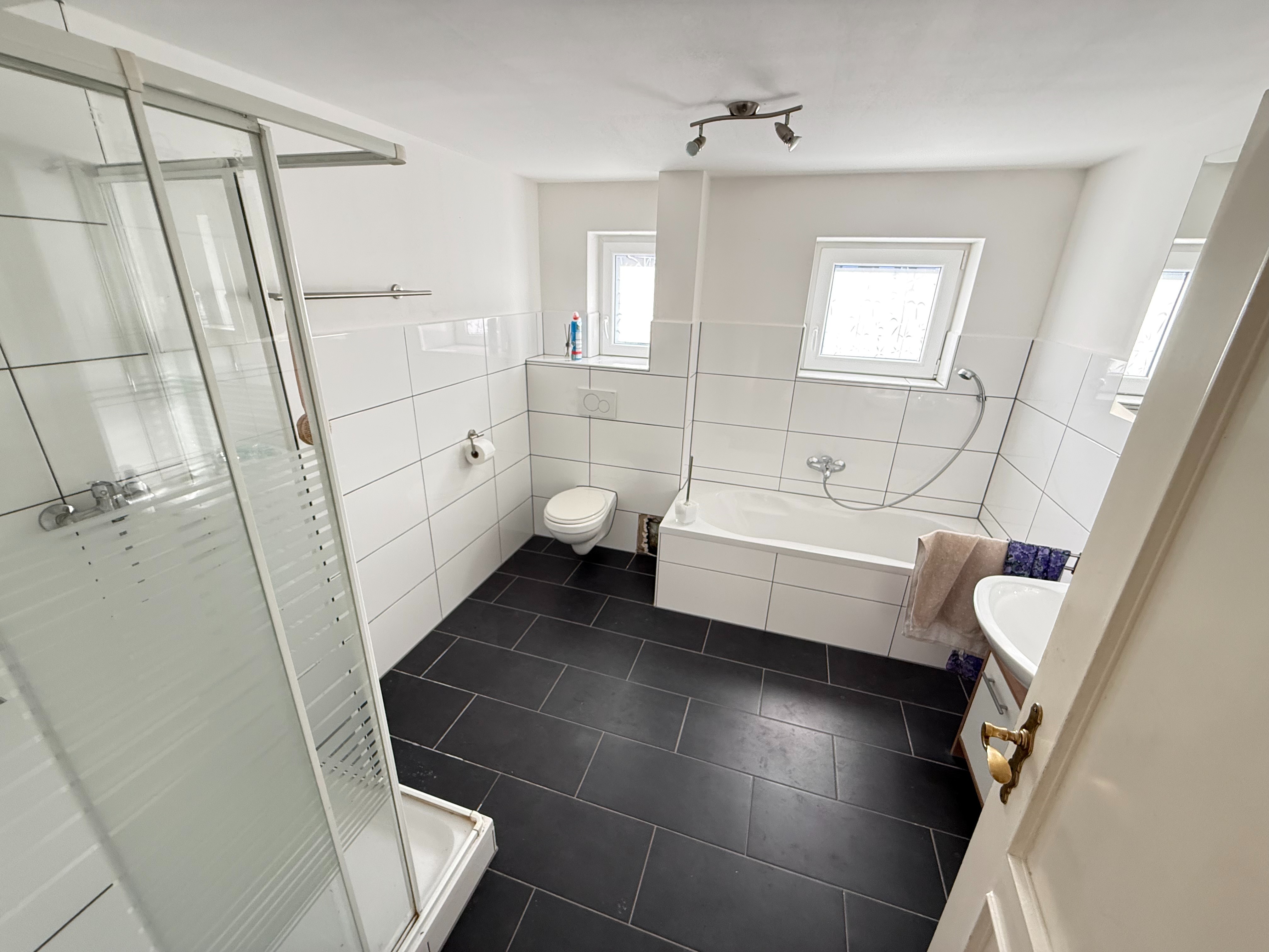 - Ausstattung des Bades Badewanne, Dusche, Fenster