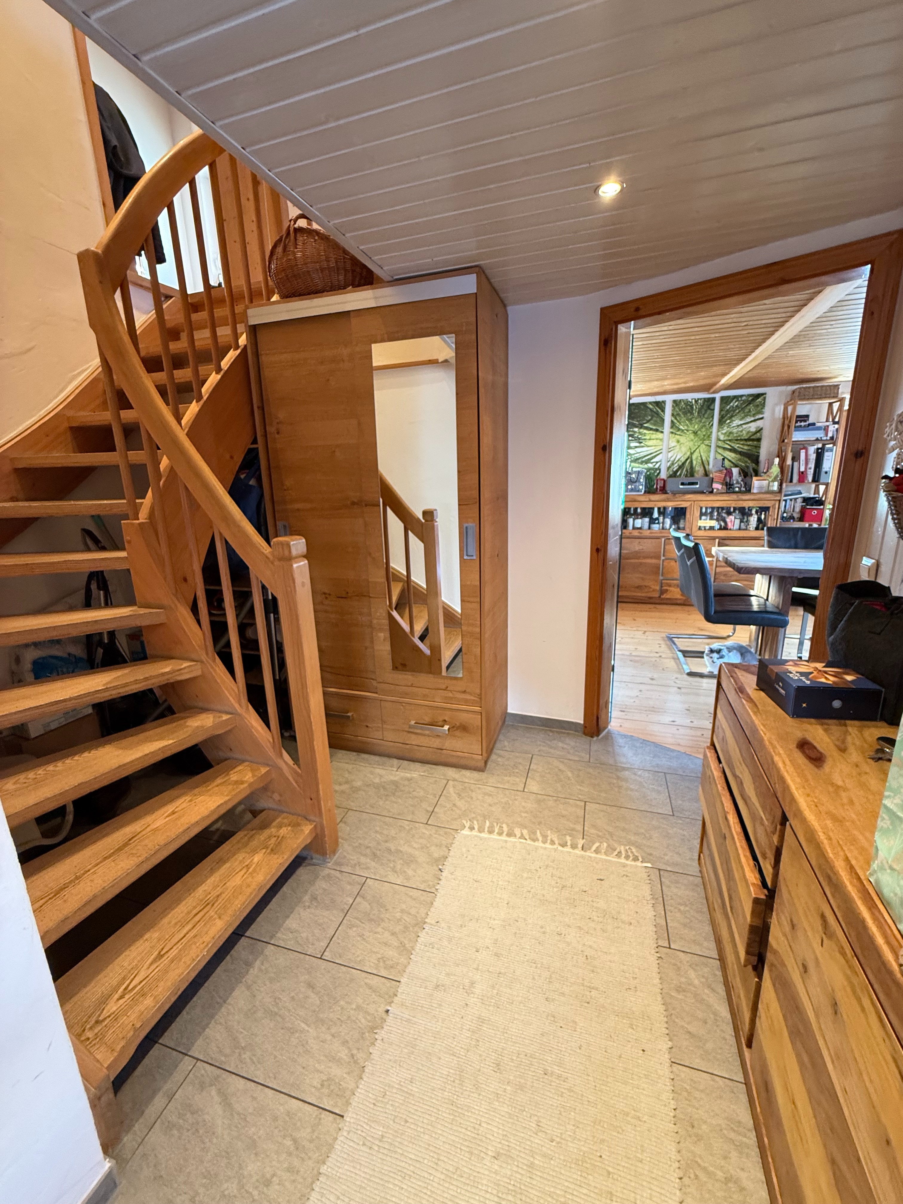 Vom Esszimmer Verbindungstüre in den Anbau. Hier gelangt man über eine Treppe nach unten in das gemütliche Wohnzimmer mit Zugang zur Terrasse/ Garten.